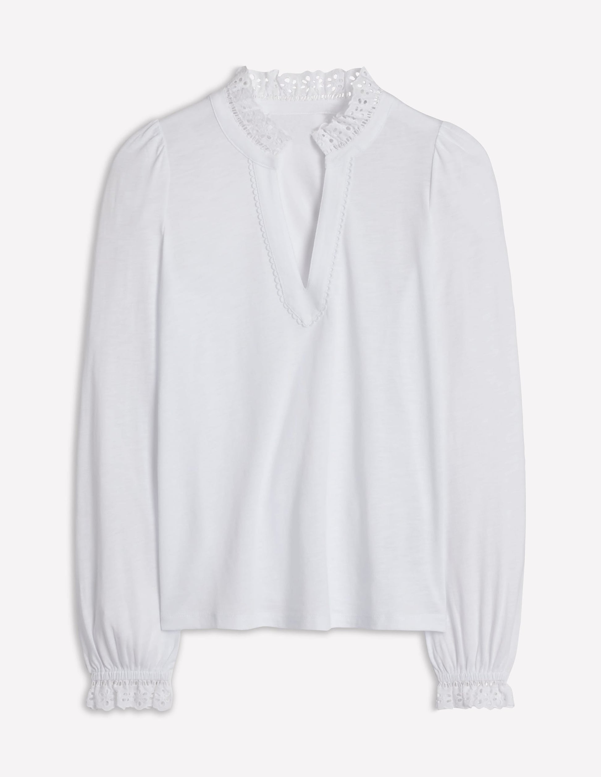 We work hard to perfect our basics. so they're less basic. Exhibit A: our Aria top with its billowy sleeves and feminine broderie trim. Pair with jeans now. layer under a knit later.