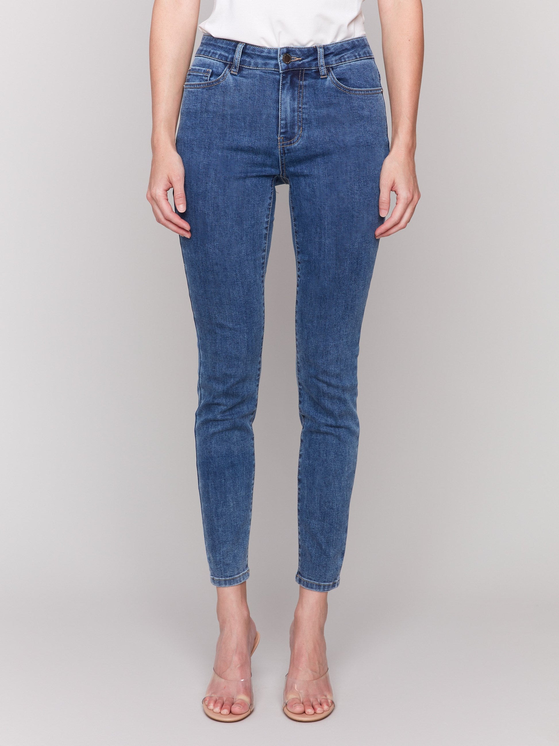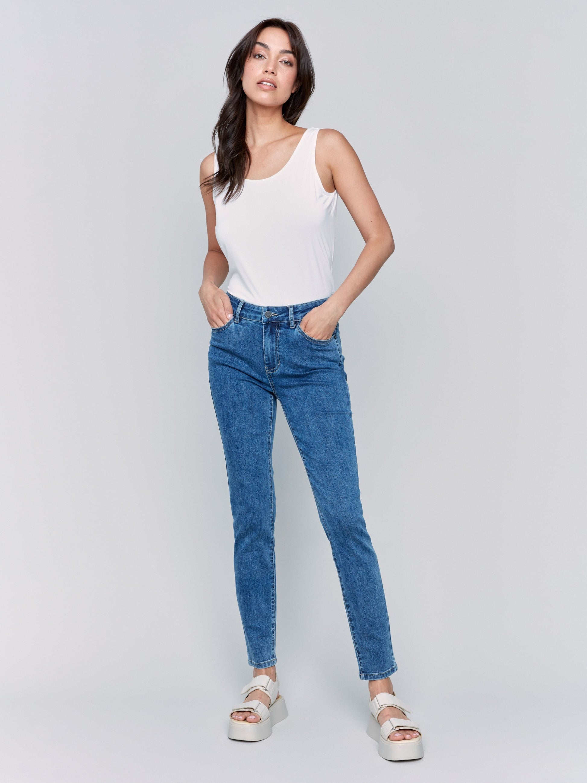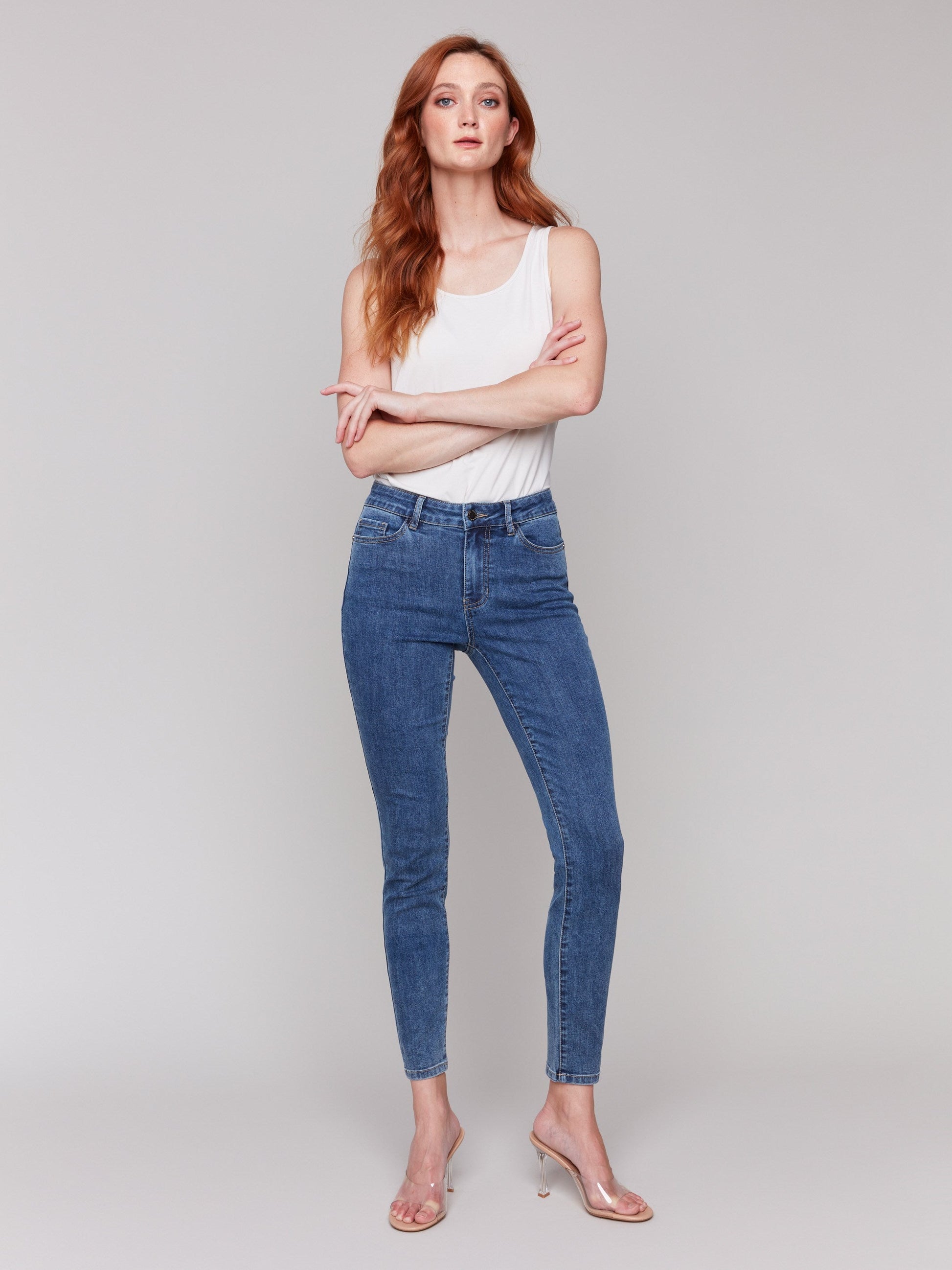 Slip into these stylish Carine Skinny Jeans in Medium Blue and elevate your everyday style. Featuring a flattering fit. they offer versatility to effortlessly transition from day to night. Perfect for pairing with a chic blouse or a casual tee. these jeans are the ultimate spring and summer wardrobe staple you've been searching for.