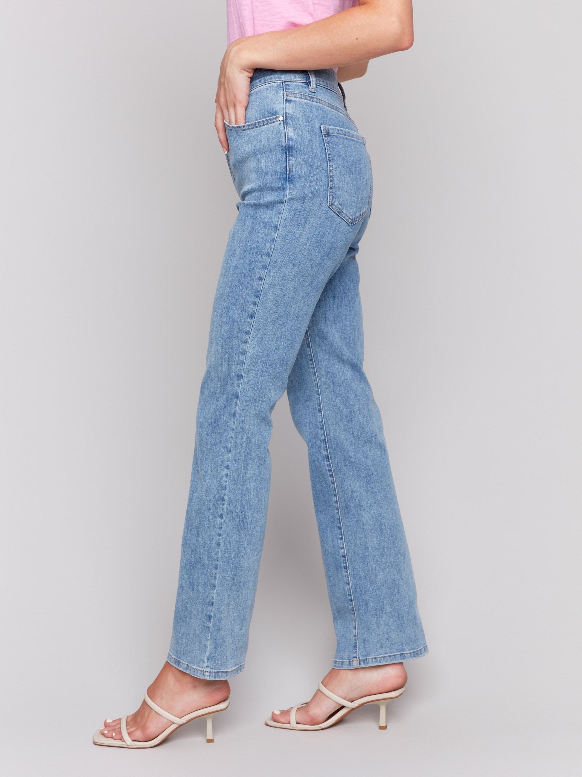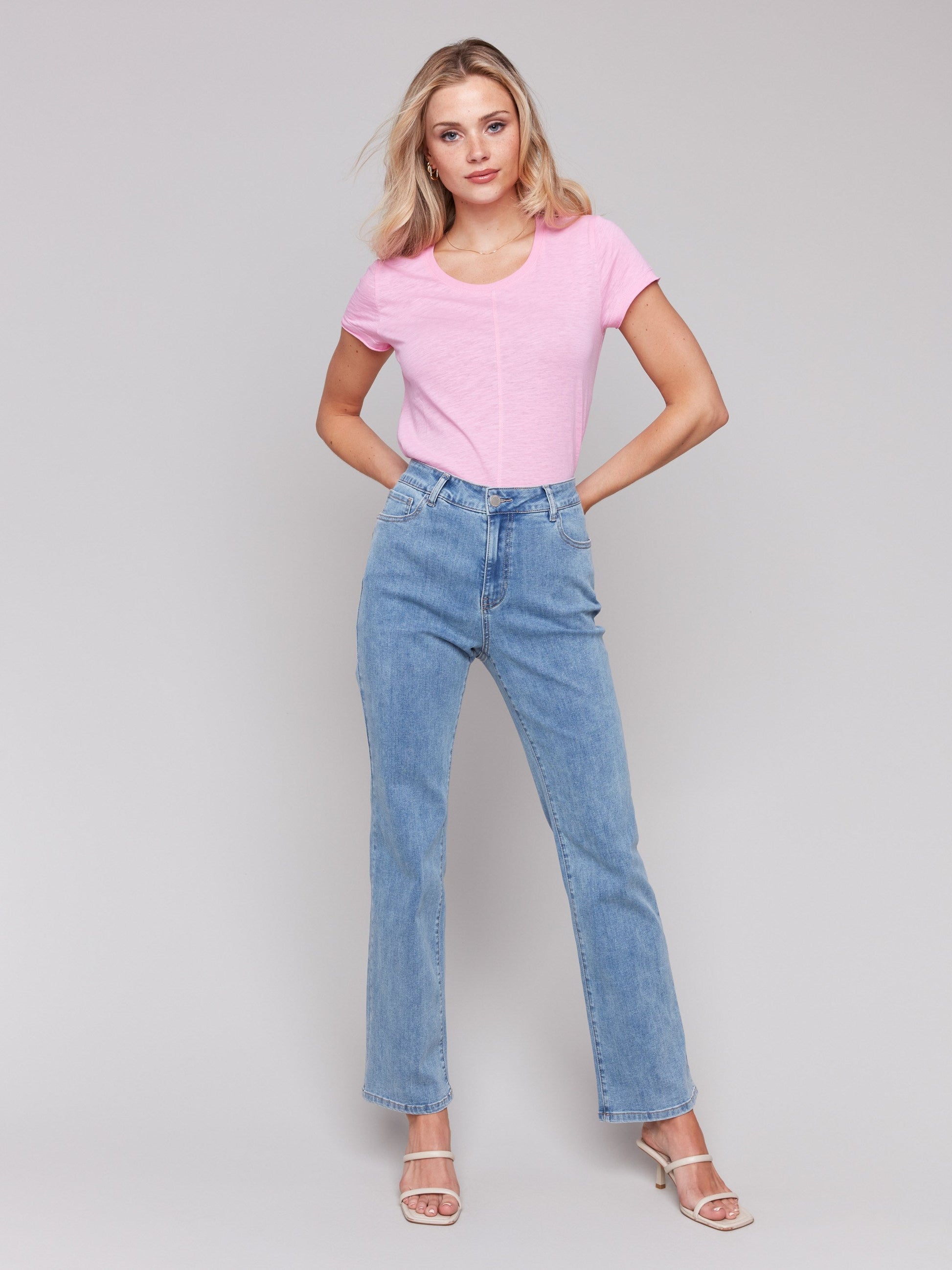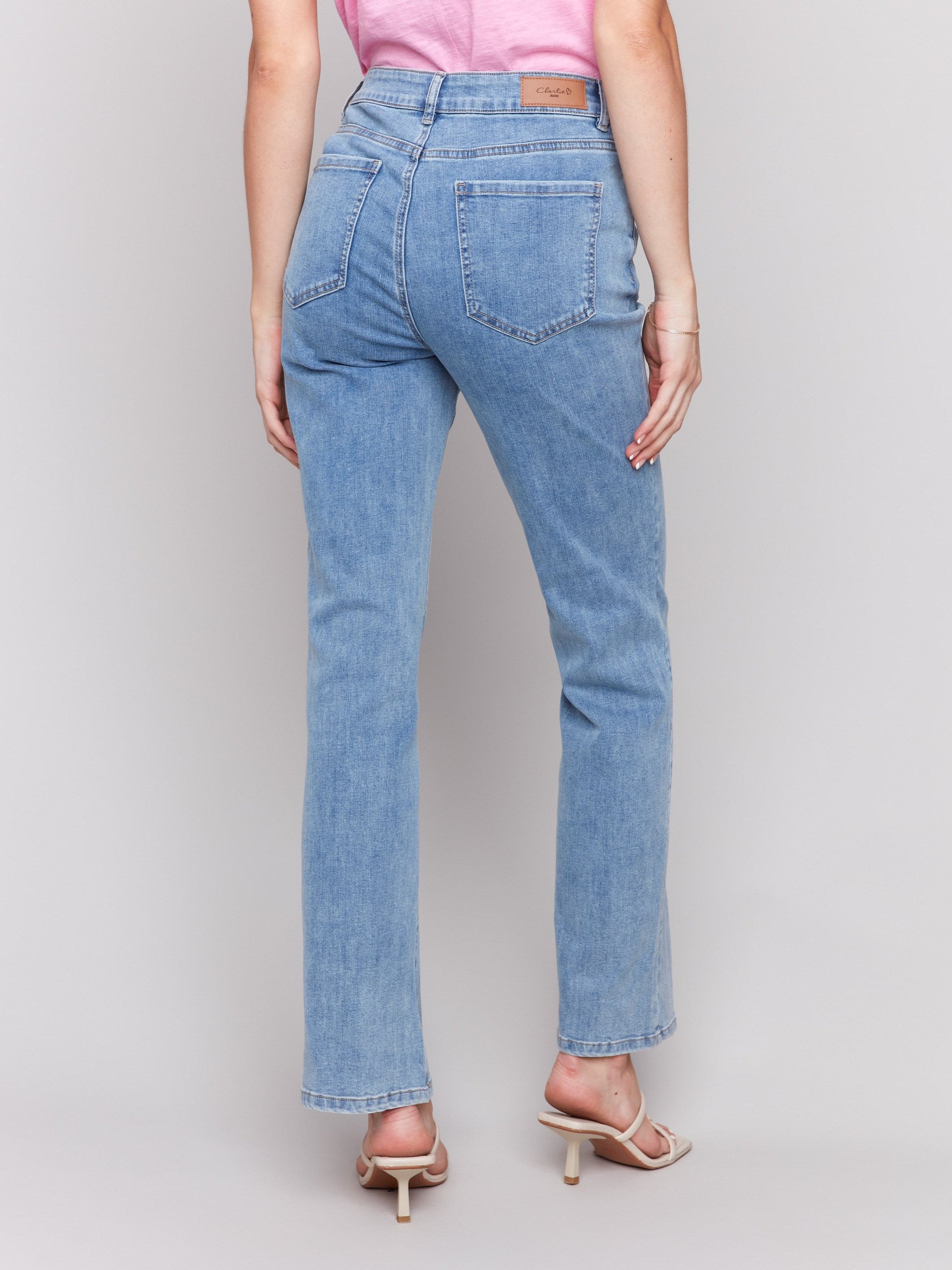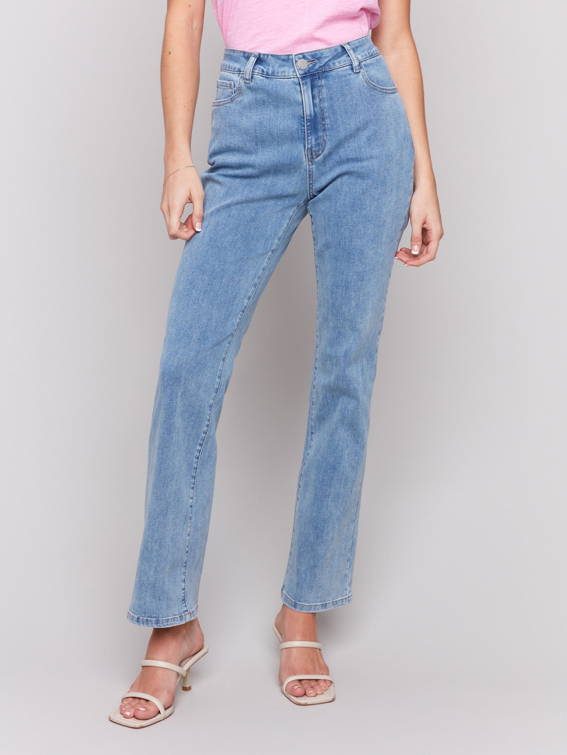 Revamp your closet with our chic. versatile jeans—the epitome of style meeting comfort. Crafted from a soft cotton blend with a flattering flare leg. these light blue jeans promise day-long comfort. The classic five-pocket design and subtle stretch enhance any ensemble. while the regular rise adds a touch of sophistication. elegantly defining your figure. Don't wait to embrace this exquisite blend of fashion and elegance!