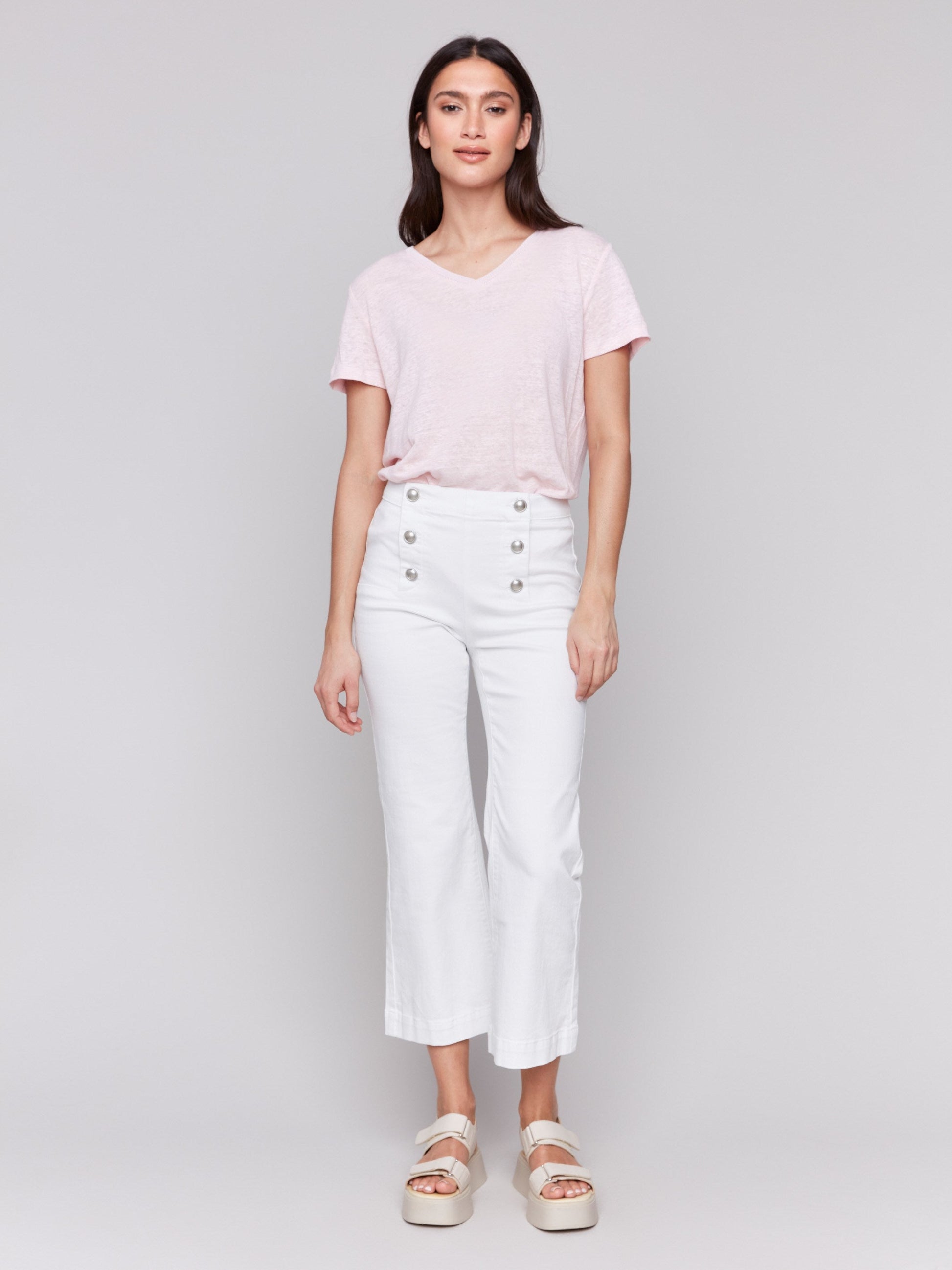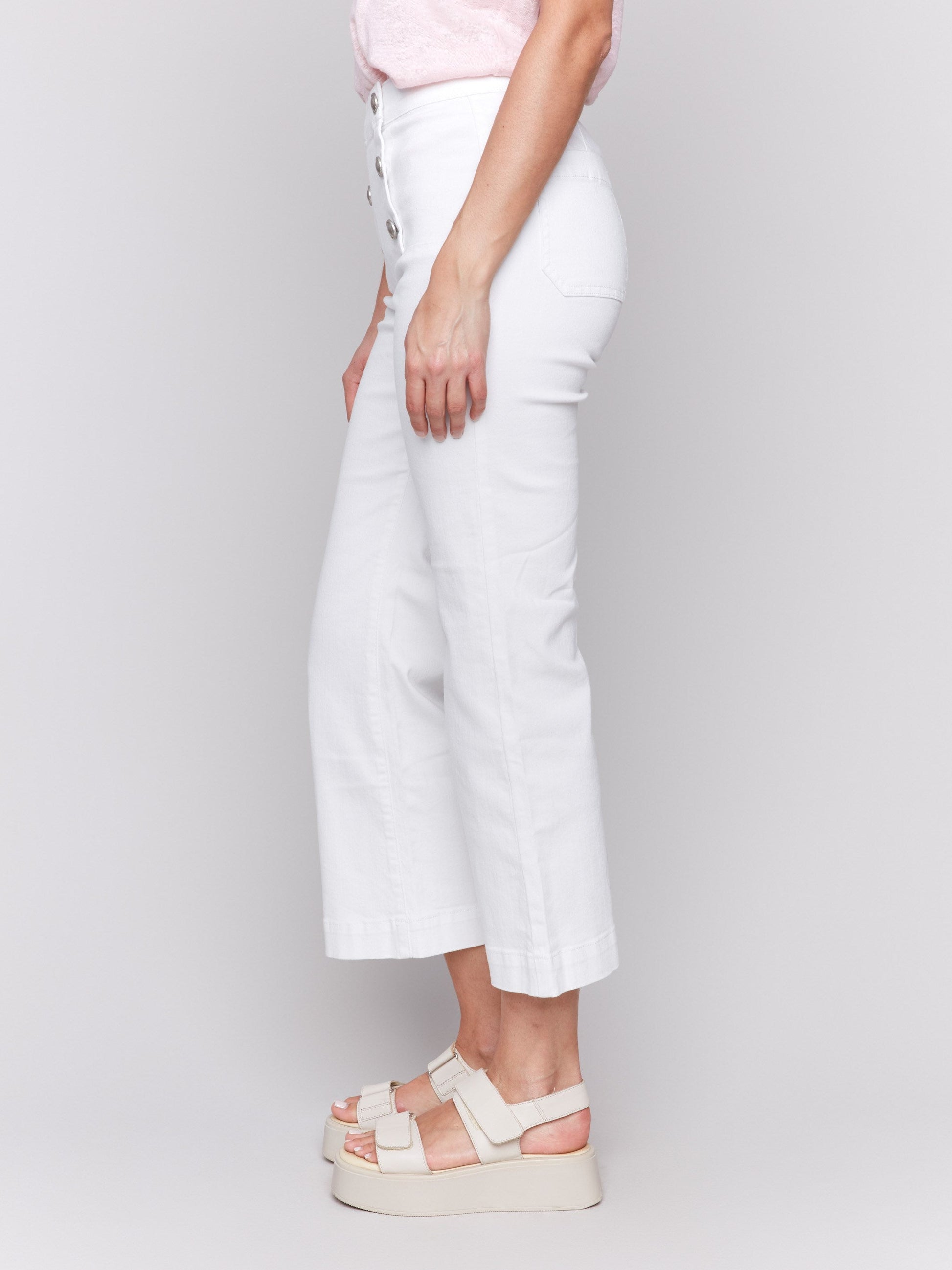 Experience the blend of style and modern flair with our trendy pull-on white cropped jeans. Ideal for bright days. the front buttons turn up your style effortlessly. Match them with sneakers or heels for a lively and dynamic look. Instantly transform your spring and summer closet with these versatile essentials.