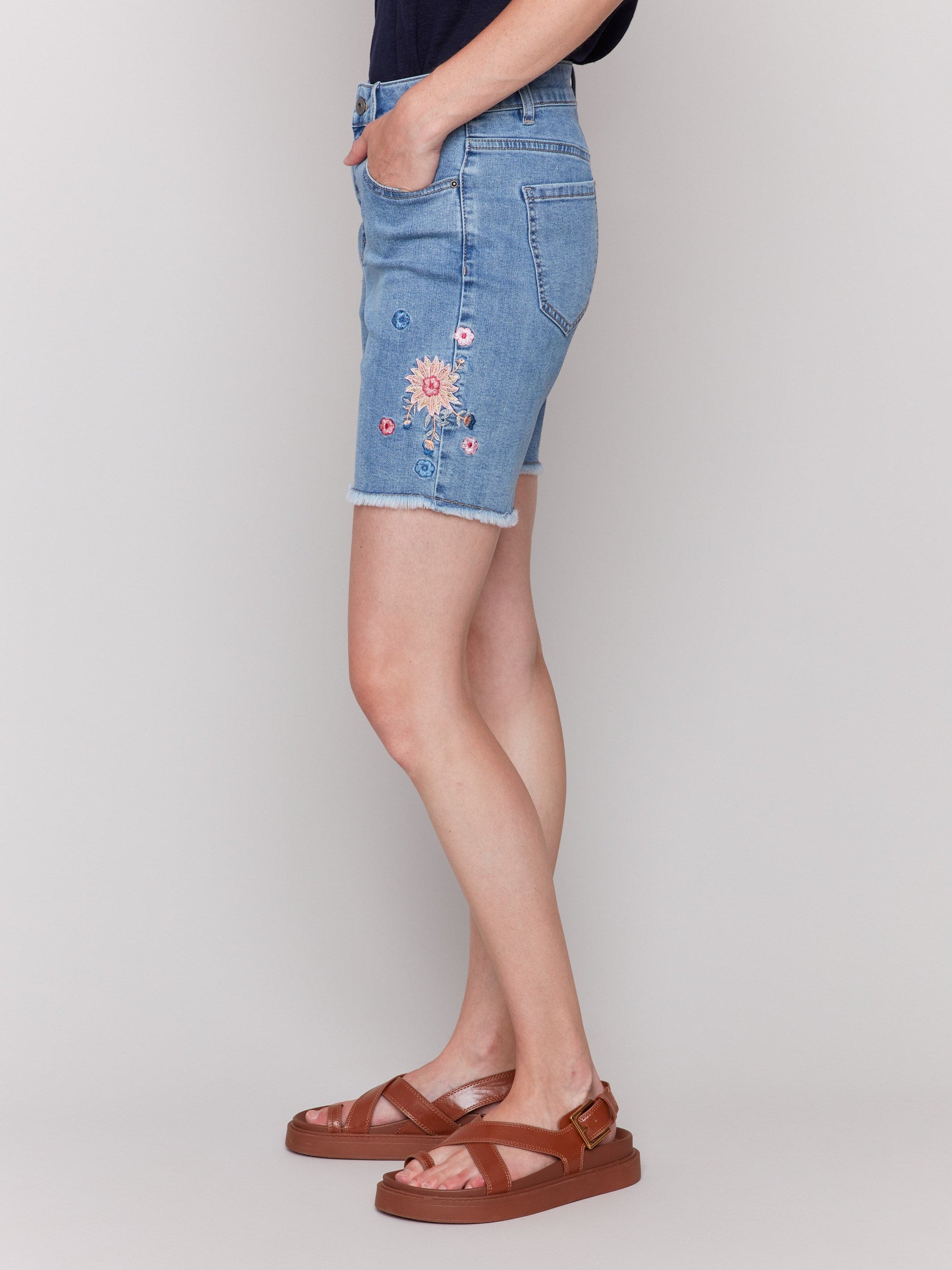 Embroidered Fringed Hem Denim Shorts - Light Blue