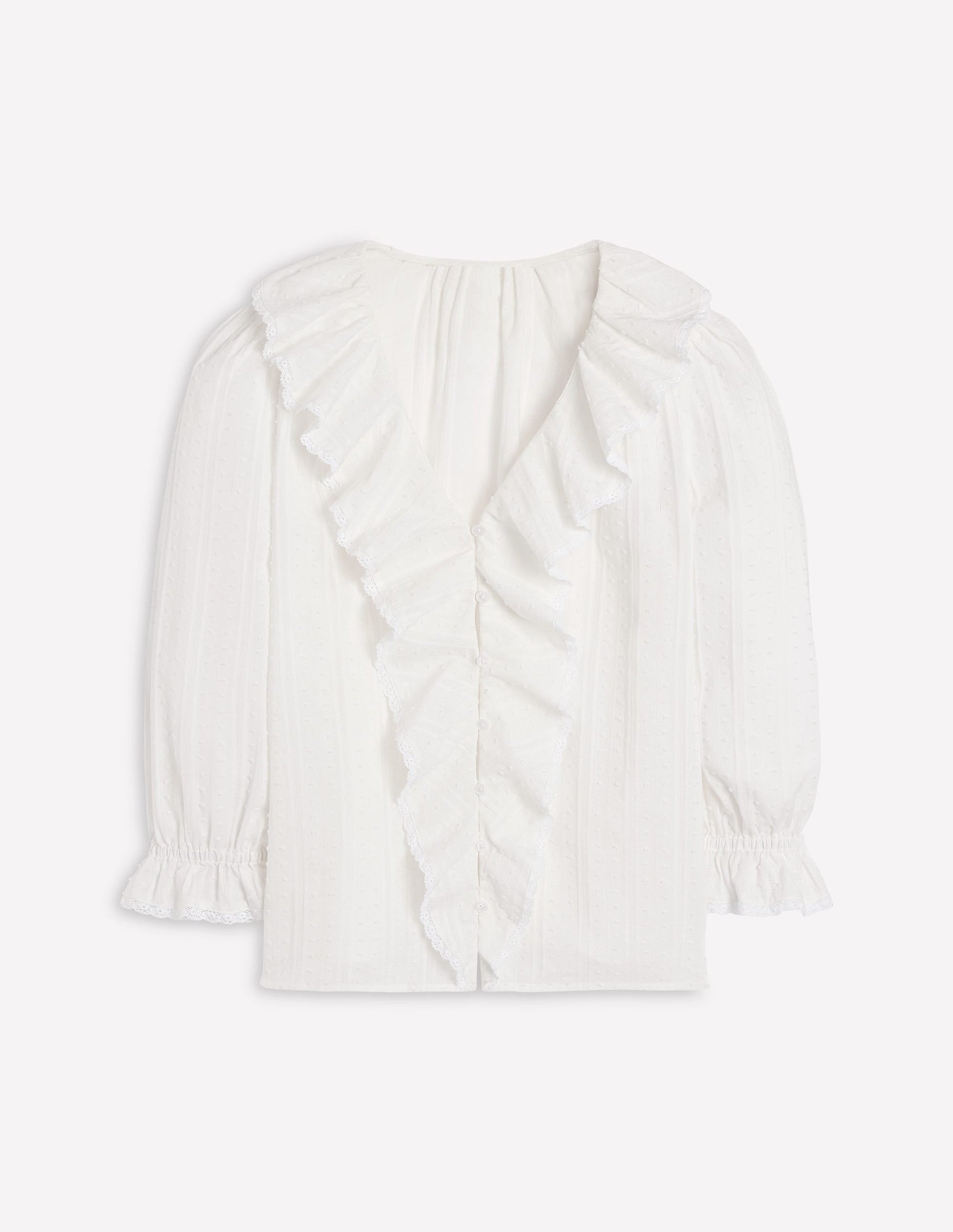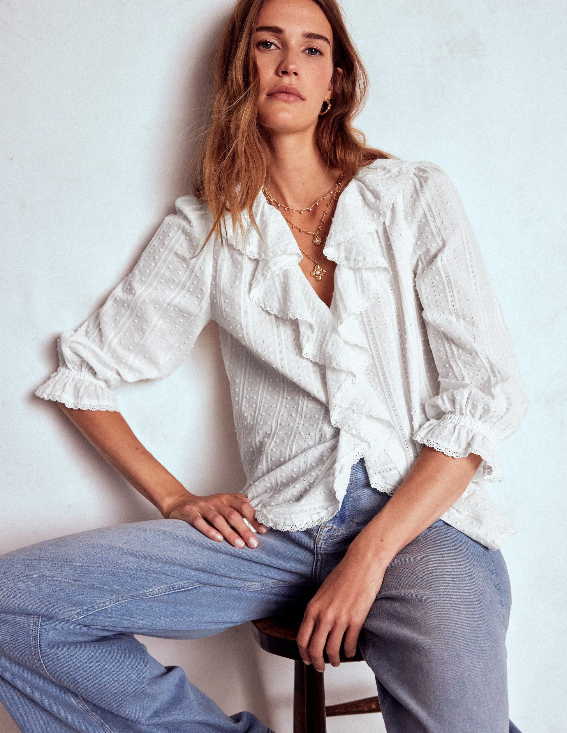 A romantic ruffle is the perfect seasonal update. Spun from pure cotton. this boho-inspired blouse is a joy to wear and we added some dotty texture too. Pair with high-waisted denim and you're well on your way to an Almost Famous moment.